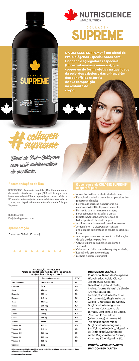 O Collagen Supreme® é um Blend de Pró-Colágenos Especializados com Licopeno e agregadores especiais (fibras, vitaminas e minerais), que cooperam de forma efetiva na qualidade da pele, dos cabelos e das unhas, além dos benefícios naturais de sua composição em todo o corpo.