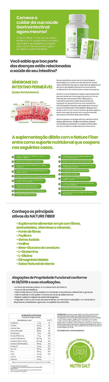 Ingredientes: Maçã (desidratada moída), Ameixa (desidratada moída), Mamão (desidratado moído), Goma acácia/arábica (Acácia senegal L.), Beta-glucana de Levedura (Saccharomyces cerevisiae), Psyllium (Plantago ovatae), Inulina, Gengibre (Zingiber officinale) pó, Óleo de Coco (Cocos nucifera L.) pó, Dimagnésio malato e Bisglicinato de Magnésio,  Fosfato Tricálcico (antiumectante), L-Glicina, L-Glutamina, Vitamina C, Aroma Natural de Menta, Vitamina B3 (Niacina/Ácido Nicotínico), Zinco Bisglicinato, Vitamina B6 (Cloridrato de Piridoxina), Vitamina B9 (Ácido fólico), Picolinato de Cromo e Vitamina D3 (Colecalciferol).